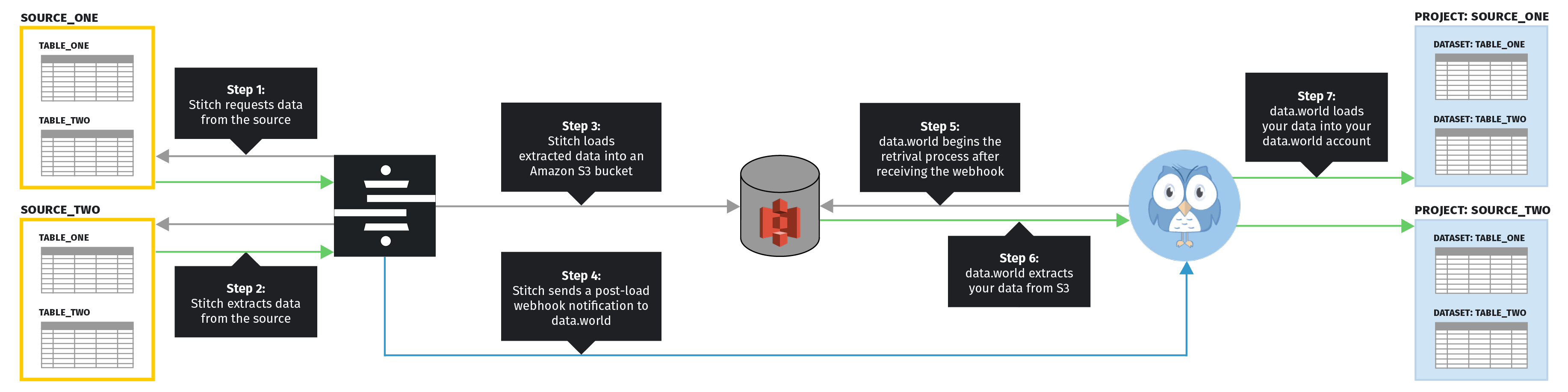 After Stitch successfully finishes loading into Amazon S3, a webhook notification is sent to data.world to trigger the retrieval process.