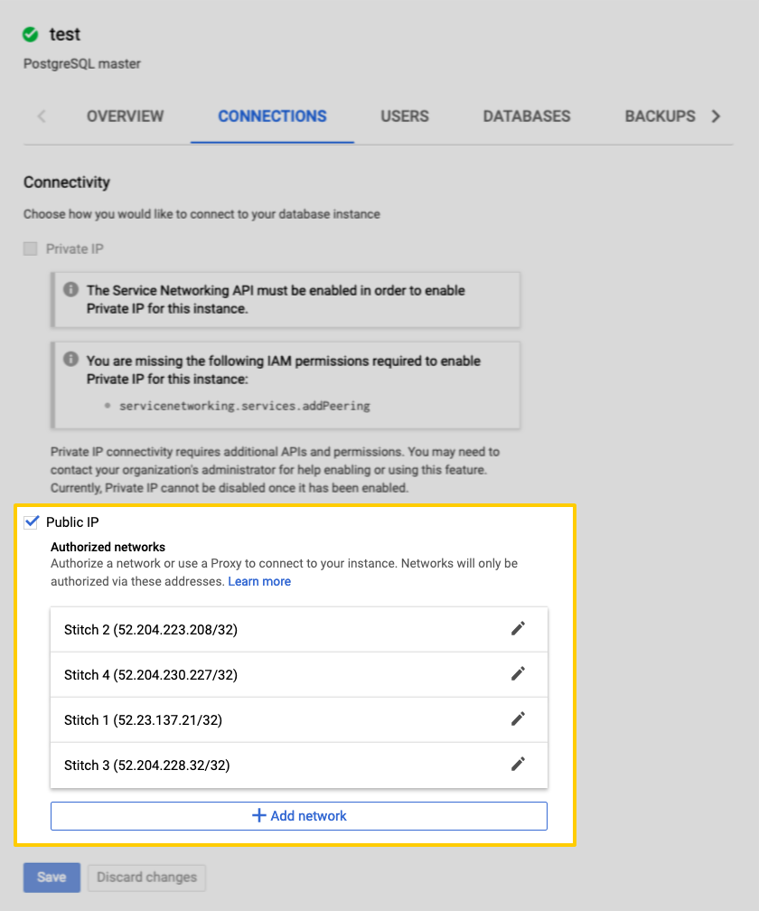 For Stitch to successfully connect with your CloudSQL instance, you’ll need to add our IP addresses to the database’s authorized networks list.