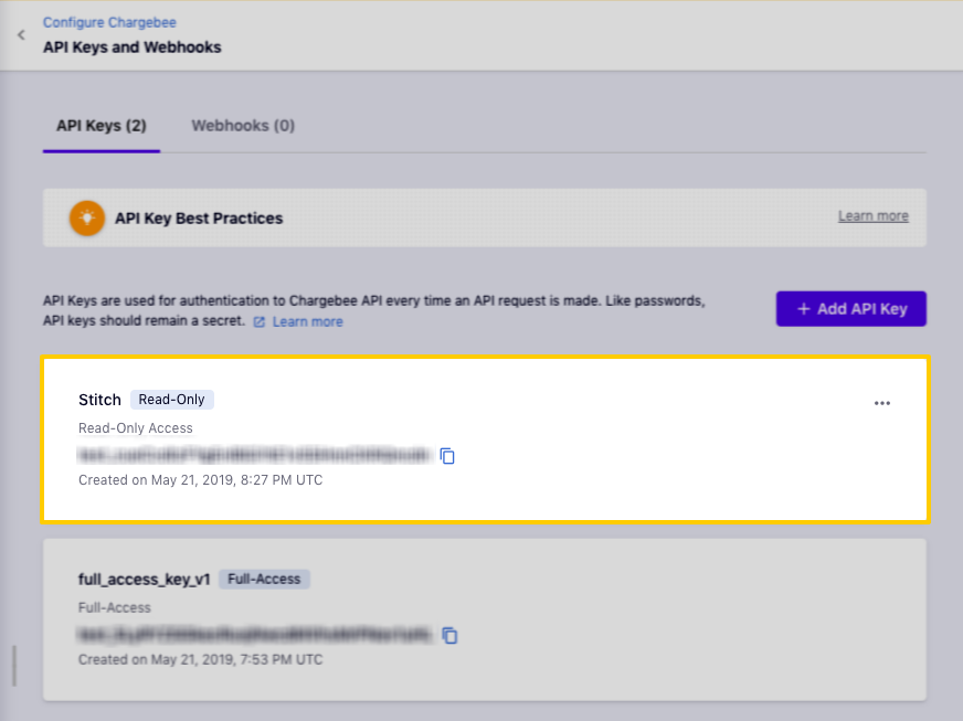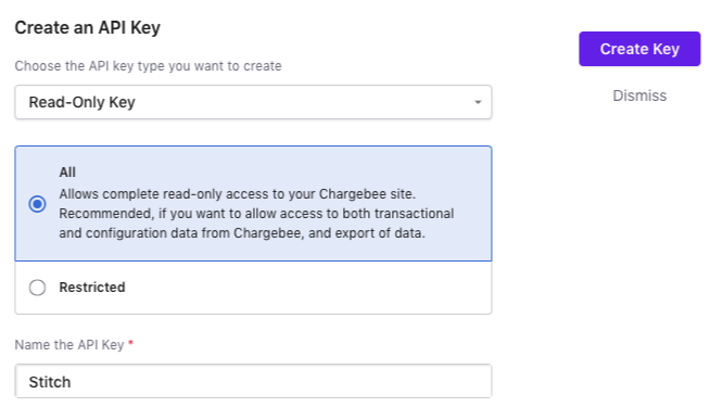 First, you’ll generate a Chargebee API Key for Stitch. This will allow Stitch to read data from your Chargebee account using the Chargebee API.