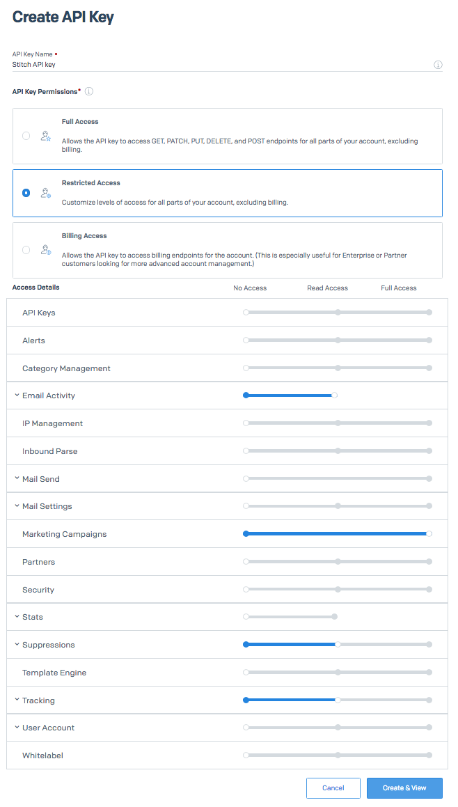 - Marketing Campaigns - Full Access (Note: SendGrid doesn’t currently provide a read-only level for this object.)